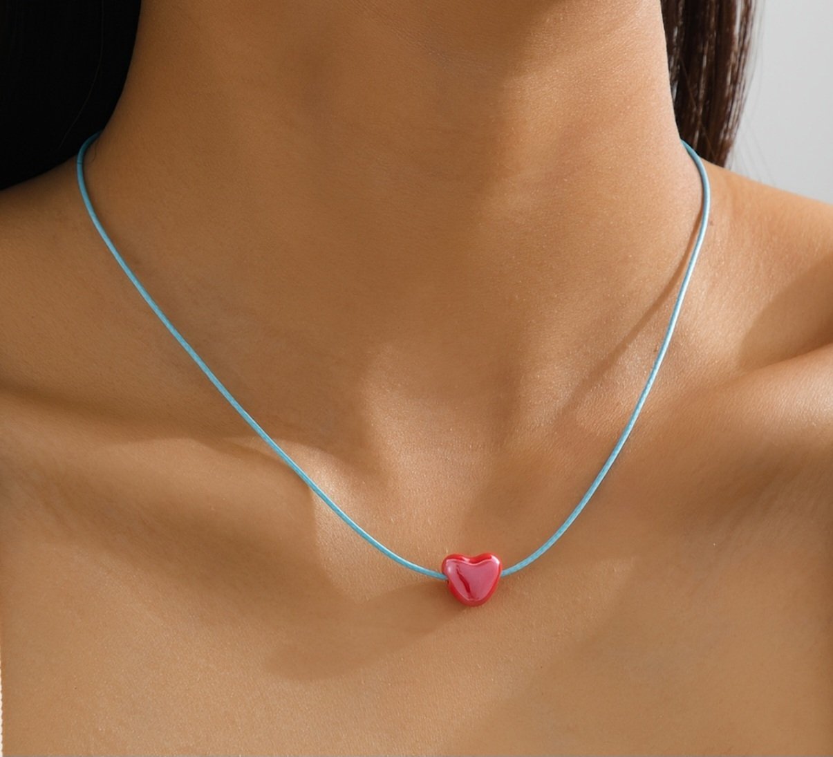A minimal necklace featuring a red ceramic heart on a light blue waxed cord.