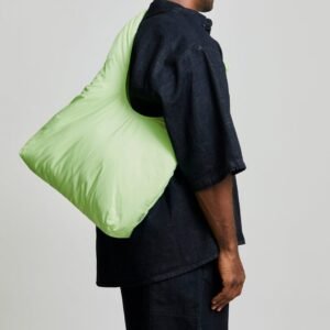 “A quilted bag designed to be worn both as a shoulder bag and a crossbody, thanks to its adjustable sliding knots. Made from 100% recycled plastic, the soft quilted fabric makes it lightweight and приятant to the touch. It features a spacious main compartment and a zip pocket for small essentials. Magnetic closure.”