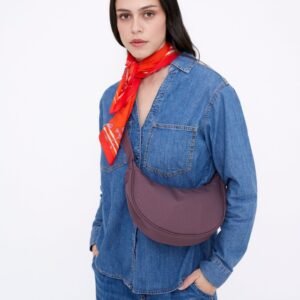Half moon bag with zippered closure. It features an inner zipped pocket to keep your smaller items accesible. Ajustable cotton webbing straps.