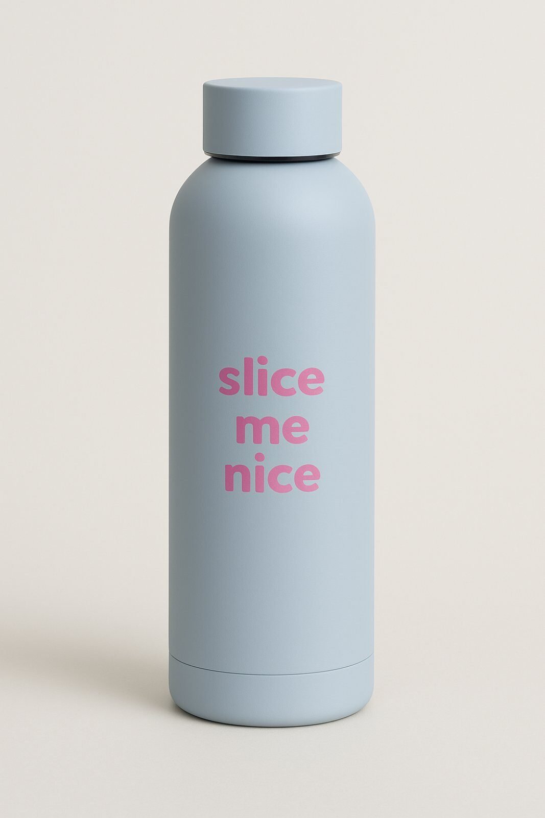 Stay refreshed in style ✨ The water bottle “slice me nice” combines functionality with a minimal aesthetic. Made from stainless steel 🪙 with a sleek matte sky blue finish 🎨, it’s designed to keep your drinks at the right temperature for hours ❄️🔥.